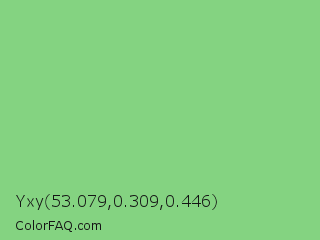 Yxy 53.079,0.309,0.446 Color is a light green color and the nearest color is Pastel Green #77dd77. Hex code #84d381 and RGB value is rgb(132,211,129). In RGB color space, this color is composed of 52% red, 83% green, 51% blue, In CMYK color space, this color is composed of 37% cyan, 0% magenta, 39% yellow , 17% black , In HSL color space, this color has a hue angle of 118° , 48% saturation and 67% lightness.