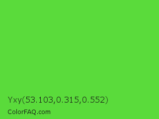 Yxy 53.103,0.315,0.552 Color is a normal green color and the nearest color is Lime Green #32cd32. Hex code #5adb3b and RGB value is rgb(90,219,59). In RGB color space, this color is composed of 35% red, 86% green, 23% blue, In CMYK color space, this color is composed of 59% cyan, 0% magenta, 73% yellow , 14% black , In HSL color space, this color has a hue angle of 108° , 69% saturation and 55% lightness.