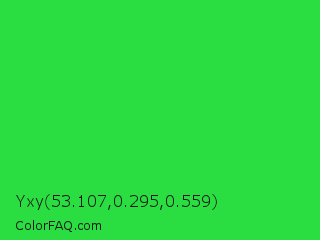 Yxy 53.107,0.295,0.559 Color is a normal green color and the nearest color is Lime Green #32cd32. Hex code #2ade42 and RGB value is rgb(42,222,66). In RGB color space, this color is composed of 16% red, 87% green, 26% blue, In CMYK color space, this color is composed of 81% cyan, 0% magenta, 70% yellow , 13% black , In HSL color space, this color has a hue angle of 128° , 73% saturation and 52% lightness.