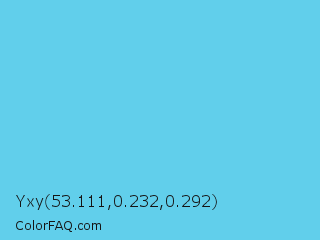 Yxy 53.111,0.232,0.292 Color is a light cyan color and the nearest color is Turquoise Blue #6cdae7. Hex code #61cfeb and RGB value is rgb(97,207,235). In RGB color space, this color is composed of 38% red, 81% green, 92% blue, In CMYK color space, this color is composed of 59% cyan, 12% magenta, 0% yellow , 8% black , In HSL color space, this color has a hue angle of 192° , 78% saturation and 65% lightness.
