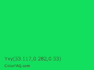 Yxy 53.117,0.282,0.53 Color is a normal green color and the nearest color is Malachite #0bda51. Hex code #11de5c and RGB value is rgb(17,222,92). In RGB color space, this color is composed of 7% red, 87% green, 36% blue, In CMYK color space, this color is composed of 92% cyan, 0% magenta, 59% yellow , 13% black , In HSL color space, this color has a hue angle of 142° , 86% saturation and 47% lightness.