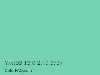Yxy 53.13,0.27,0.373 Color is a light green color and the nearest color is Downy #6fd0c5. Hex code #74d2b3 and RGB value is rgb(116,210,179). In RGB color space, this color is composed of 45% red, 82% green, 70% blue, In CMYK color space, this color is composed of 45% cyan, 0% magenta, 15% yellow , 18% black , In HSL color space, this color has a hue angle of 160° , 51% saturation and 64% lightness.