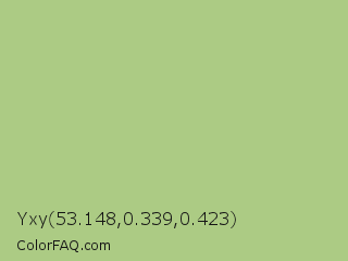 Yxy 53.148,0.339,0.423 Color is a light green color and the nearest color is Swamp Green #acb78e. Hex code #accb84 and RGB value is rgb(172,203,132). In RGB color space, this color is composed of 67% red, 80% green, 52% blue, In CMYK color space, this color is composed of 15% cyan, 0% magenta, 35% yellow , 20% black , In HSL color space, this color has a hue angle of 86° , 41% saturation and 66% lightness.