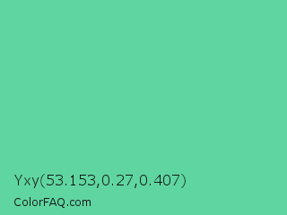 Yxy 53.153,0.27,0.407 Color is a light green color and the nearest color is Medium Aquamarine #66ddaa. Hex code #5fd6a1 and RGB value is rgb(95,214,161). In RGB color space, this color is composed of 37% red, 84% green, 63% blue, In CMYK color space, this color is composed of 56% cyan, 0% magenta, 25% yellow , 16% black , In HSL color space, this color has a hue angle of 153° , 59% saturation and 61% lightness.