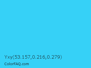 Yxy 53.157,0.216,0.279 Color is a normal cyan color and the nearest color is Picton Blue #45b1e8. Hex code #36d1f7 and RGB value is rgb(54,209,247). In RGB color space, this color is composed of 21% red, 82% green, 97% blue, In CMYK color space, this color is composed of 78% cyan, 15% magenta, 0% yellow , 3% black , In HSL color space, this color has a hue angle of 192° , 92% saturation and 59% lightness.