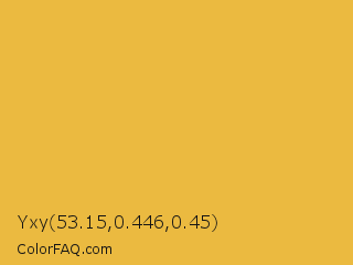 Yxy 53.15,0.446,0.45 Color is a normal orange color and the nearest color is Meat Brown #e5b73b. Hex code #ebba40 and RGB value is rgb(235,186,64). In RGB color space, this color is composed of 92% red, 73% green, 25% blue, In CMYK color space, this color is composed of 0% cyan, 21% magenta, 73% yellow , 8% black , In HSL color space, this color has a hue angle of 43° , 81% saturation and 59% lightness.