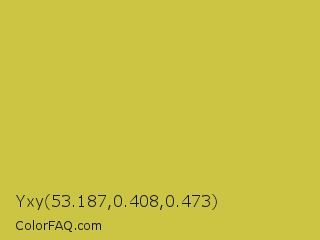 Yxy 53.187,0.408,0.473 Color is a normal yellow color and the nearest color is Turmeric #cabb48. Hex code #ccc544 and RGB value is rgb(204,197,68). In RGB color space, this color is composed of 80% red, 77% green, 27% blue, In CMYK color space, this color is composed of 0% cyan, 3% magenta, 67% yellow , 20% black , In HSL color space, this color has a hue angle of 57° , 57% saturation and 53% lightness.