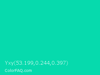 Yxy 53.199,0.244,0.397 Color is a normal cyan color and the nearest color is Amazonite #00c4b0. Hex code #06daad and RGB value is rgb(6,218,173). In RGB color space, this color is composed of 2% red, 85% green, 68% blue, In CMYK color space, this color is composed of 97% cyan, 0% magenta, 21% yellow , 15% black , In HSL color space, this color has a hue angle of 167° , 95% saturation and 44% lightness.