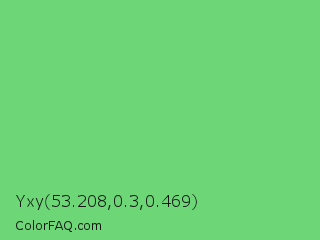 Yxy 53.208,0.3,0.469 Color is a light green color and the nearest color is Pastel Green #77dd77. Hex code #6dd778 and RGB value is rgb(109,215,120). In RGB color space, this color is composed of 43% red, 84% green, 47% blue, In CMYK color space, this color is composed of 49% cyan, 0% magenta, 44% yellow , 16% black , In HSL color space, this color has a hue angle of 126° , 57% saturation and 64% lightness.