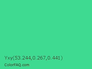 Yxy 53.244,0.267,0.441 Color is a normal green color and the nearest color is Shamrock #33cc99. Hex code #3fda91 and RGB value is rgb(63,218,145). In RGB color space, this color is composed of 25% red, 85% green, 57% blue, In CMYK color space, this color is composed of 71% cyan, 0% magenta, 33% yellow , 15% black , In HSL color space, this color has a hue angle of 152° , 68% saturation and 55% lightness.