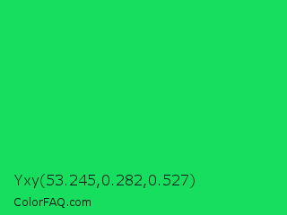 Yxy 53.245,0.282,0.527 Color is a normal green color and the nearest color is Malachite #0bda51. Hex code #17de5e and RGB value is rgb(23,222,94). In RGB color space, this color is composed of 9% red, 87% green, 37% blue, In CMYK color space, this color is composed of 90% cyan, 0% magenta, 58% yellow , 13% black , In HSL color space, this color has a hue angle of 141° , 81% saturation and 48% lightness.