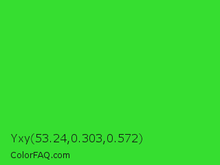 Yxy 53.24,0.303,0.572 Color is a normal green color and the nearest color is Lime Green #32cd32. Hex code #36de30 and RGB value is rgb(54,222,48). In RGB color space, this color is composed of 21% red, 87% green, 19% blue, In CMYK color space, this color is composed of 76% cyan, 0% magenta, 78% yellow , 13% black , In HSL color space, this color has a hue angle of 118° , 73% saturation and 53% lightness.