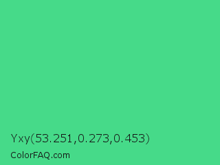 Yxy 53.251,0.273,0.453 Color is a normal green color and the nearest color is Emerald #50c878. Hex code #46da89 and RGB value is rgb(70,218,137). In RGB color space, this color is composed of 27% red, 85% green, 54% blue, In CMYK color space, this color is composed of 68% cyan, 0% magenta, 37% yellow , 15% black , In HSL color space, this color has a hue angle of 147° , 67% saturation and 56% lightness.