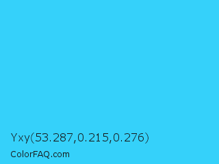 Yxy 53.287,0.215,0.276 Color is a normal cyan color and the nearest color is Picton Blue #45b1e8. Hex code #35d1fa and RGB value is rgb(53,209,250). In RGB color space, this color is composed of 21% red, 82% green, 98% blue, In CMYK color space, this color is composed of 79% cyan, 16% magenta, 0% yellow , 2% black , In HSL color space, this color has a hue angle of 192° , 95% saturation and 59% lightness.