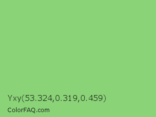 Yxy 53.324,0.319,0.459 Color is a light green color and the nearest color is Pistachio #93c572. Hex code #8ad377 and RGB value is rgb(138,211,119). In RGB color space, this color is composed of 54% red, 83% green, 47% blue, In CMYK color space, this color is composed of 35% cyan, 0% magenta, 44% yellow , 17% black , In HSL color space, this color has a hue angle of 108° , 51% saturation and 65% lightness.