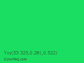 Yxy 53.325,0.281,0.522 Color is a normal green color and the nearest color is Malachite #0bda51. Hex code #1ade61 and RGB value is rgb(26,222,97). In RGB color space, this color is composed of 10% red, 87% green, 38% blue, In CMYK color space, this color is composed of 88% cyan, 0% magenta, 56% yellow , 13% black , In HSL color space, this color has a hue angle of 142° , 79% saturation and 49% lightness.