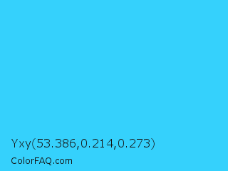 Yxy 53.386,0.214,0.273 Color is a normal cyan color and the nearest color is Picton Blue #45b1e8. Hex code #35d1fc and RGB value is rgb(53,209,252). In RGB color space, this color is composed of 21% red, 82% green, 99% blue, In CMYK color space, this color is composed of 79% cyan, 17% magenta, 0% yellow , 1% black , In HSL color space, this color has a hue angle of 193° , 97% saturation and 60% lightness.