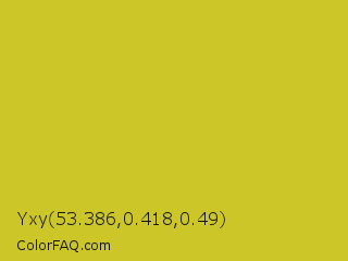 Yxy 53.386,0.418,0.49 Color is a normal yellow color and the nearest color is Key Lime Pie #bfc921. Hex code #ccc629 and RGB value is rgb(204,198,41). In RGB color space, this color is composed of 80% red, 78% green, 16% blue, In CMYK color space, this color is composed of 0% cyan, 3% magenta, 80% yellow , 20% black , In HSL color space, this color has a hue angle of 58° , 67% saturation and 48% lightness.