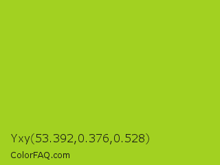 Yxy 53.392,0.376,0.528 Color is a normal lime color and the nearest color is Atlantis #97cd2d. Hex code #a2d121 and RGB value is rgb(162,209,33). In RGB color space, this color is composed of 64% red, 82% green, 13% blue, In CMYK color space, this color is composed of 22% cyan, 0% magenta, 84% yellow , 18% black , In HSL color space, this color has a hue angle of 76° , 73% saturation and 47% lightness.