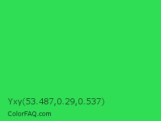 Yxy 53.487,0.29,0.537 Color is a normal green color and the nearest color is UFO Green #3cd070. Hex code #2fde54 and RGB value is rgb(47,222,84). In RGB color space, this color is composed of 18% red, 87% green, 33% blue, In CMYK color space, this color is composed of 79% cyan, 0% magenta, 62% yellow , 13% black , In HSL color space, this color has a hue angle of 133° , 73% saturation and 53% lightness.