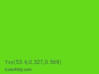 Yxy 53.4,0.327,0.569 Color is a normal green color and the nearest color is Harlequin Green #46cb18. Hex code #63db1c and RGB value is rgb(99,219,28). In RGB color space, this color is composed of 39% red, 86% green, 11% blue, In CMYK color space, this color is composed of 55% cyan, 0% magenta, 87% yellow , 14% black , In HSL color space, this color has a hue angle of 98° , 77% saturation and 48% lightness.