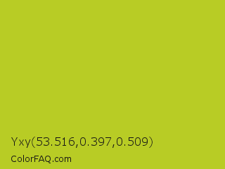 Yxy 53.516,0.397,0.509 Color is a normal yellow color and the nearest color is Key Lime Pie #bfc921. Hex code #b8cc25 and RGB value is rgb(184,204,37). In RGB color space, this color is composed of 72% red, 80% green, 15% blue, In CMYK color space, this color is composed of 10% cyan, 0% magenta, 82% yellow , 20% black , In HSL color space, this color has a hue angle of 67° , 69% saturation and 47% lightness.