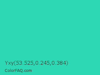 Yxy 53.525,0.245,0.384 Color is a normal cyan color and the nearest color is Turquoise PWG #30d5c8. Hex code #2dd9b4 and RGB value is rgb(45,217,180). In RGB color space, this color is composed of 18% red, 85% green, 71% blue, In CMYK color space, this color is composed of 79% cyan, 0% magenta, 17% yellow , 15% black , In HSL color space, this color has a hue angle of 167° , 69% saturation and 51% lightness.