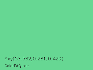 Yxy 53.532,0.281,0.429 Color is a light green color and the nearest color is Very Light Malachite Green #64e986. Hex code #66d793 and RGB value is rgb(102,215,147). In RGB color space, this color is composed of 40% red, 84% green, 58% blue, In CMYK color space, this color is composed of 53% cyan, 0% magenta, 32% yellow , 16% black , In HSL color space, this color has a hue angle of 144° , 59% saturation and 62% lightness.