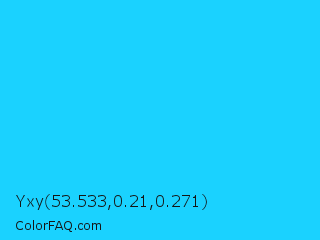 Yxy 53.533,0.21,0.271 Color is a normal cyan color and the nearest color is Spiro Disco Ball #0fc0fc. Hex code #1ad2ff and RGB value is rgb(26,210,255). In RGB color space, this color is composed of 10% red, 82% green, 100% blue, In CMYK color space, this color is composed of 90% cyan, 18% magenta, 0% yellow , 0% black , In HSL color space, this color has a hue angle of 192° , 100% saturation and 55% lightness.
