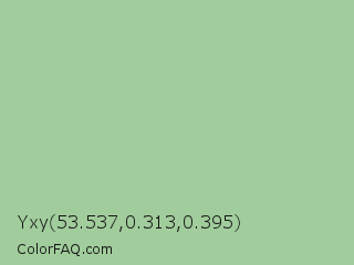 Yxy 53.537,0.313,0.395 Color is a light green color and the nearest color is Eton Blue #96c8a2. Hex code #a1cd9c and RGB value is rgb(161,205,156). In RGB color space, this color is composed of 63% red, 80% green, 61% blue, In CMYK color space, this color is composed of 21% cyan, 0% magenta, 24% yellow , 20% black , In HSL color space, this color has a hue angle of 114° , 33% saturation and 71% lightness.