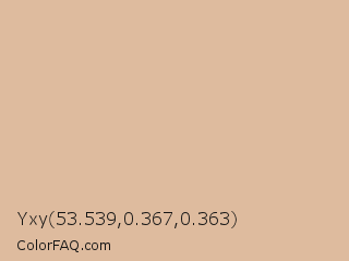 Yxy 53.539,0.367,0.363 Color is a light orange color and the nearest color is Cameo #d9b99b. Hex code #debb9e and RGB value is rgb(222,187,158). In RGB color space, this color is composed of 87% red, 73% green, 62% blue, In CMYK color space, this color is composed of 0% cyan, 16% magenta, 29% yellow , 13% black , In HSL color space, this color has a hue angle of 27° , 49% saturation and 75% lightness.