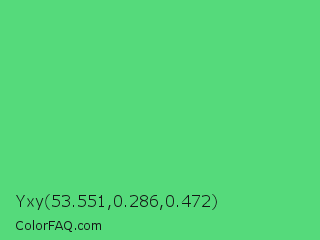 Yxy 53.551,0.286,0.472 Color is a normal green color and the nearest color is Emerald #50c878. Hex code #55da7b and RGB value is rgb(85,218,123). In RGB color space, this color is composed of 33% red, 85% green, 48% blue, In CMYK color space, this color is composed of 61% cyan, 0% magenta, 44% yellow , 15% black , In HSL color space, this color has a hue angle of 137° , 64% saturation and 59% lightness.