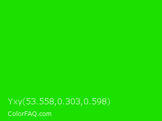 Yxy 53.558,0.303,0.598 Color is a normal green color and the nearest color is Green #00ff00. Hex code #1ce000 and RGB value is rgb(28,224,0). In RGB color space, this color is composed of 11% red, 88% green, 0% blue, In CMYK color space, this color is composed of 88% cyan, 0% magenta, 100% yellow , 12% black , In HSL color space, this color has a hue angle of 113° , 100% saturation and 44% lightness.