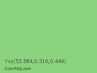 Yxy 53.584,0.316,0.449 Color is a light green color and the nearest color is Pistachio #93c572. Hex code #8bd37e and RGB value is rgb(139,211,126). In RGB color space, this color is composed of 55% red, 83% green, 49% blue, In CMYK color space, this color is composed of 34% cyan, 0% magenta, 40% yellow , 17% black , In HSL color space, this color has a hue angle of 111° , 49% saturation and 66% lightness.