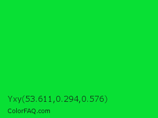 Yxy 53.611,0.294,0.576 Color is a normal green color and the nearest color is Vivid Malachite #00cc33. Hex code #08e034 and RGB value is rgb(8,224,52). In RGB color space, this color is composed of 3% red, 88% green, 20% blue, In CMYK color space, this color is composed of 96% cyan, 0% magenta, 77% yellow , 12% black , In HSL color space, this color has a hue angle of 132° , 93% saturation and 45% lightness.