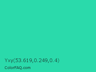 Yxy 53.619,0.249,0.4 Color is a normal cyan color and the nearest color is Shamrock #33cc99. Hex code #2adaab and RGB value is rgb(42,218,171). In RGB color space, this color is composed of 16% red, 85% green, 67% blue, In CMYK color space, this color is composed of 81% cyan, 0% magenta, 22% yellow , 15% black , In HSL color space, this color has a hue angle of 164° , 70% saturation and 51% lightness.