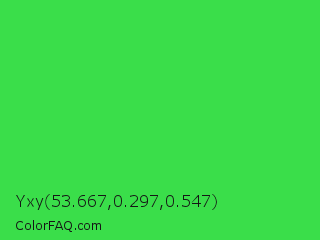 Yxy 53.667,0.297,0.547 Color is a normal green color and the nearest color is Lime Green #32cd32. Hex code #3ade4a and RGB value is rgb(58,222,74). In RGB color space, this color is composed of 23% red, 87% green, 29% blue, In CMYK color space, this color is composed of 74% cyan, 0% magenta, 67% yellow , 13% black , In HSL color space, this color has a hue angle of 126° , 71% saturation and 55% lightness.