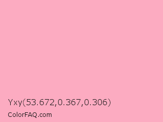 Yxy 53.672,0.367,0.306 Color is a very light rose color and the nearest color is Nadeshiko Pink #f6adc6. Hex code #fcabc1 and RGB value is rgb(252,171,193). In RGB color space, this color is composed of 99% red, 67% green, 76% blue, In CMYK color space, this color is composed of 0% cyan, 32% magenta, 23% yellow , 1% black , In HSL color space, this color has a hue angle of 344° , 93% saturation and 83% lightness.