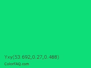 Yxy 53.692,0.27,0.488 Color is a normal green color and the nearest color is Spring Green #00ff7f. Hex code #0ede78 and RGB value is rgb(14,222,120). In RGB color space, this color is composed of 5% red, 87% green, 47% blue, In CMYK color space, this color is composed of 94% cyan, 0% magenta, 46% yellow , 13% black , In HSL color space, this color has a hue angle of 151° , 88% saturation and 46% lightness.