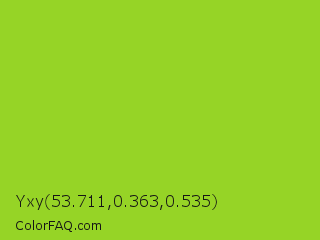 Yxy 53.711,0.363,0.535 Color is a normal green color and the nearest color is Atlantis #97cd2d. Hex code #96d426 and RGB value is rgb(150,212,38). In RGB color space, this color is composed of 59% red, 83% green, 15% blue, In CMYK color space, this color is composed of 29% cyan, 0% magenta, 82% yellow , 17% black , In HSL color space, this color has a hue angle of 81° , 70% saturation and 49% lightness.