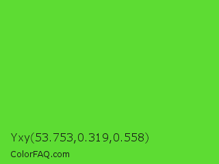 Yxy 53.753,0.319,0.558 Color is a normal green color and the nearest color is Harlequin Green #46cb18. Hex code #5ddc33 and RGB value is rgb(93,220,51). In RGB color space, this color is composed of 36% red, 86% green, 20% blue, In CMYK color space, this color is composed of 58% cyan, 0% magenta, 77% yellow , 14% black , In HSL color space, this color has a hue angle of 105° , 71% saturation and 53% lightness.