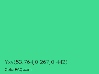 Yxy 53.764,0.267,0.442 Color is a normal green color and the nearest color is Shamrock #33cc99. Hex code #3fdb91 and RGB value is rgb(63,219,145). In RGB color space, this color is composed of 25% red, 86% green, 57% blue, In CMYK color space, this color is composed of 71% cyan, 0% magenta, 34% yellow , 14% black , In HSL color space, this color has a hue angle of 152° , 68% saturation and 55% lightness.