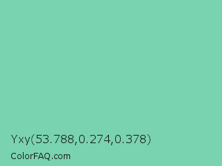 Yxy 53.788,0.274,0.378 Color is a light green color and the nearest color is Medium Aquamarine #66ddaa. Hex code #79d3b0 and RGB value is rgb(121,211,176). In RGB color space, this color is composed of 47% red, 83% green, 69% blue, In CMYK color space, this color is composed of 43% cyan, 0% magenta, 17% yellow , 17% black , In HSL color space, this color has a hue angle of 157° , 51% saturation and 65% lightness.