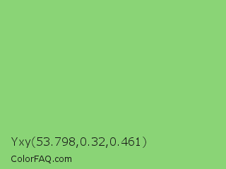 Yxy 53.798,0.32,0.461 Color is a light green color and the nearest color is Pistachio #93c572. Hex code #8ad476 and RGB value is rgb(138,212,118). In RGB color space, this color is composed of 54% red, 83% green, 46% blue, In CMYK color space, this color is composed of 35% cyan, 0% magenta, 44% yellow , 17% black , In HSL color space, this color has a hue angle of 107° , 52% saturation and 65% lightness.