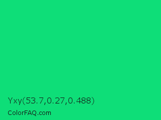 Yxy 53.7,0.27,0.488 Color is a normal green color and the nearest color is Spring Green #00ff7f. Hex code #0ede78 and RGB value is rgb(14,222,120). In RGB color space, this color is composed of 5% red, 87% green, 47% blue, In CMYK color space, this color is composed of 94% cyan, 0% magenta, 46% yellow , 13% black , In HSL color space, this color has a hue angle of 151° , 88% saturation and 46% lightness.