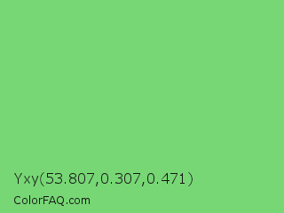 Yxy 53.807,0.307,0.471 Color is a light green color and the nearest color is Pastel Green #77dd77. Hex code #77d775 and RGB value is rgb(119,215,117). In RGB color space, this color is composed of 47% red, 84% green, 46% blue, In CMYK color space, this color is composed of 45% cyan, 0% magenta, 46% yellow , 16% black , In HSL color space, this color has a hue angle of 119° , 55% saturation and 65% lightness.