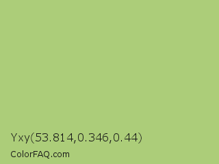 Yxy 53.814,0.346,0.44 Color is a light green color and the nearest color is Wild Willow #b9c46a. Hex code #accd79 and RGB value is rgb(172,205,121). In RGB color space, this color is composed of 67% red, 80% green, 47% blue, In CMYK color space, this color is composed of 16% cyan, 0% magenta, 41% yellow , 20% black , In HSL color space, this color has a hue angle of 84° , 46% saturation and 64% lightness.