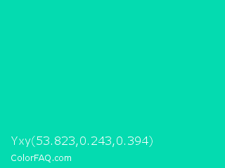 Yxy 53.823,0.243,0.394 Color is a normal cyan color and the nearest color is Amazonite #00c4b0. Hex code #04dbb0 and RGB value is rgb(4,219,176). In RGB color space, this color is composed of 2% red, 86% green, 69% blue, In CMYK color space, this color is composed of 98% cyan, 0% magenta, 20% yellow , 14% black , In HSL color space, this color has a hue angle of 168° , 96% saturation and 44% lightness.