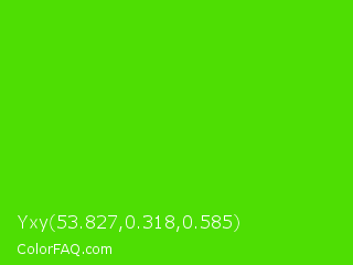 Yxy 53.827,0.318,0.585 Color is a normal green color and the nearest color is Harlequin Green #46cb18. Hex code #4ede03 and RGB value is rgb(78,222,3). In RGB color space, this color is composed of 31% red, 87% green, 1% blue, In CMYK color space, this color is composed of 65% cyan, 0% magenta, 99% yellow , 13% black , In HSL color space, this color has a hue angle of 99° , 97% saturation and 44% lightness.