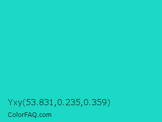 Yxy 53.831,0.235,0.359 Color is a normal cyan color and the nearest color is Turquoise PWG #30d5c8. Hex code #1bd9c4 and RGB value is rgb(27,217,196). In RGB color space, this color is composed of 11% red, 85% green, 77% blue, In CMYK color space, this color is composed of 88% cyan, 0% magenta, 10% yellow , 15% black , In HSL color space, this color has a hue angle of 173° , 78% saturation and 48% lightness.